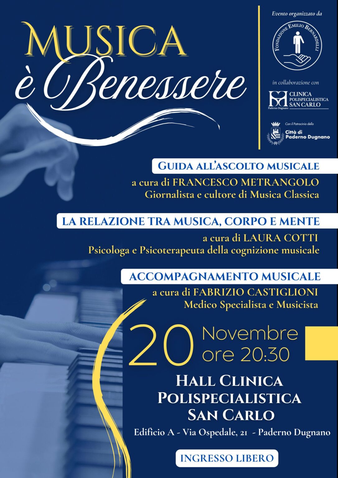 La Musica è Benessere. Perché? E come? Ne parleremo giovedì 20 novembre (dalle 20.30) in un incontro aperto alla cittadinanza, organizzato dalla Fondazione Emilio Bernardelli in collaborazione con Clinica Polispecialistica San Carlo e con il patrocinio del Comune di Paderno Dugnano.